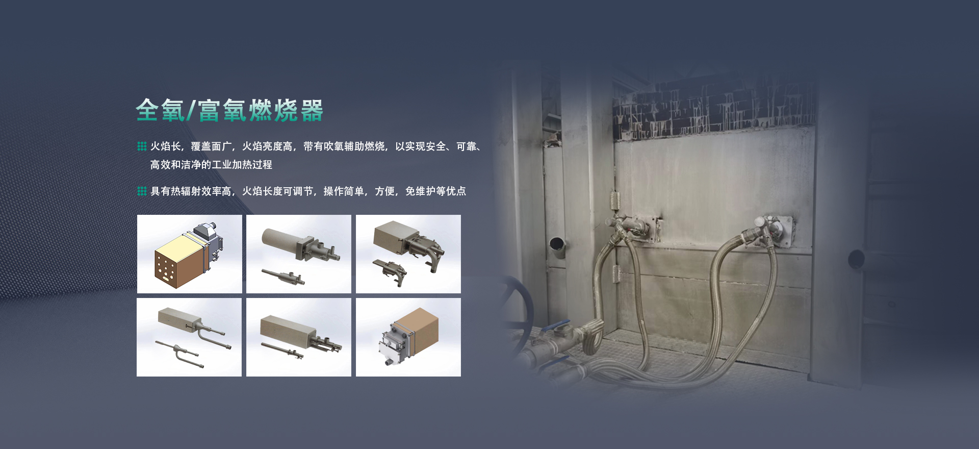 提供方案:成套熱能解決方案。高溫領域,采用全氧或富氧燃燒系統,包含全氧燃燒器、燃氣/氧氣管路系統以及自動化控制系統